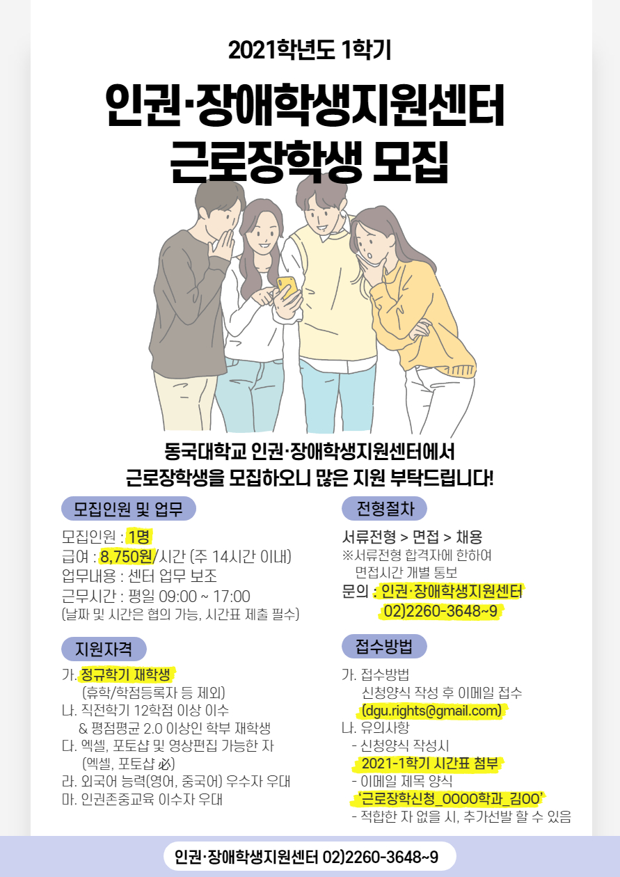 [인권·장애학생지원센터] 2021학년도 1학기 교내근로장학생 선발 안내
